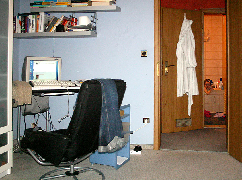Date: 2005-02-08 04:07 pm (UTC)Сижу на третьем этаже (если считать от входа, есть еще цокольный, -1 этаж) виллы в Иерусалиме, довольно-таки на окраине, но в хорошем районе. Этаж самый верхний, с наклонными потолками - высоким не везет, они иногда стукаются головой. Справа окно, за которым, если не вставать с места, видно два соседних района на холмах и шоссе. А так же пальма, развевающаяся на ветру. (Ночью ее листья чудесно отсвечивают, но сфотографировать не удается - в объективе темно.) В комнате со мной еще два человека, а третий сосед - в настоящий момент служит родине, бедняга.